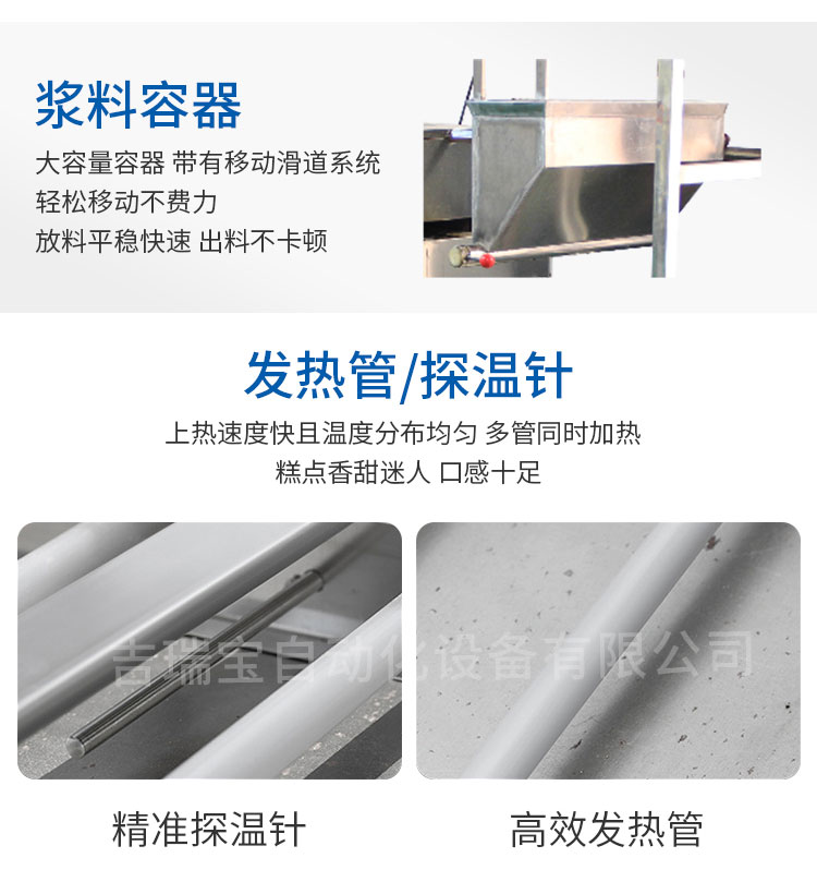⒈槽子糕機烤盤固定:對烤盤可直接固定,投料時可對烤盤直接投料,不需要人工搬進搬出,節(jié)約大量時間,能量損耗以及人工費用。
