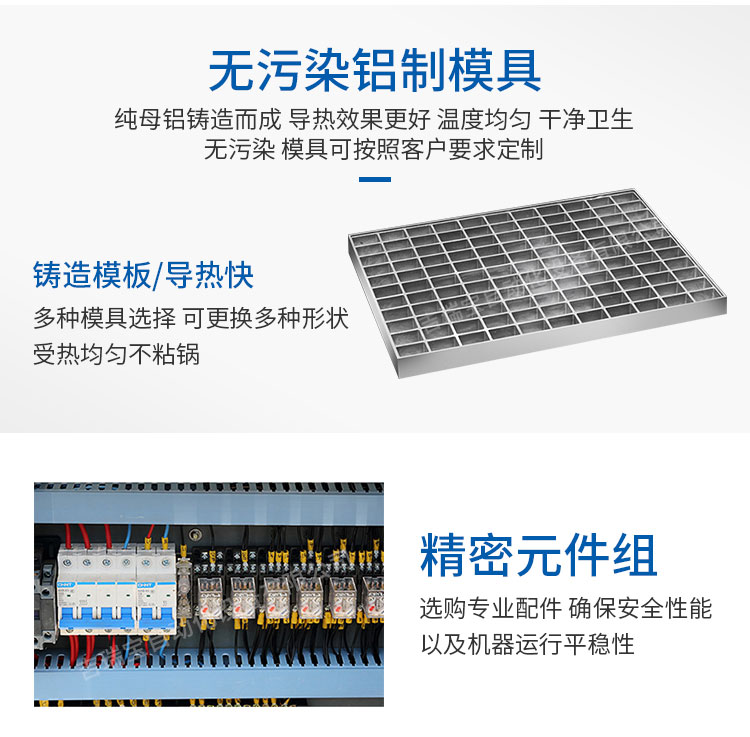 ⒉烤盤采用鑄鋁材料,傳熱速度快、模型密集,烤出的蛋糕在同等配料條件下,口感特別好。